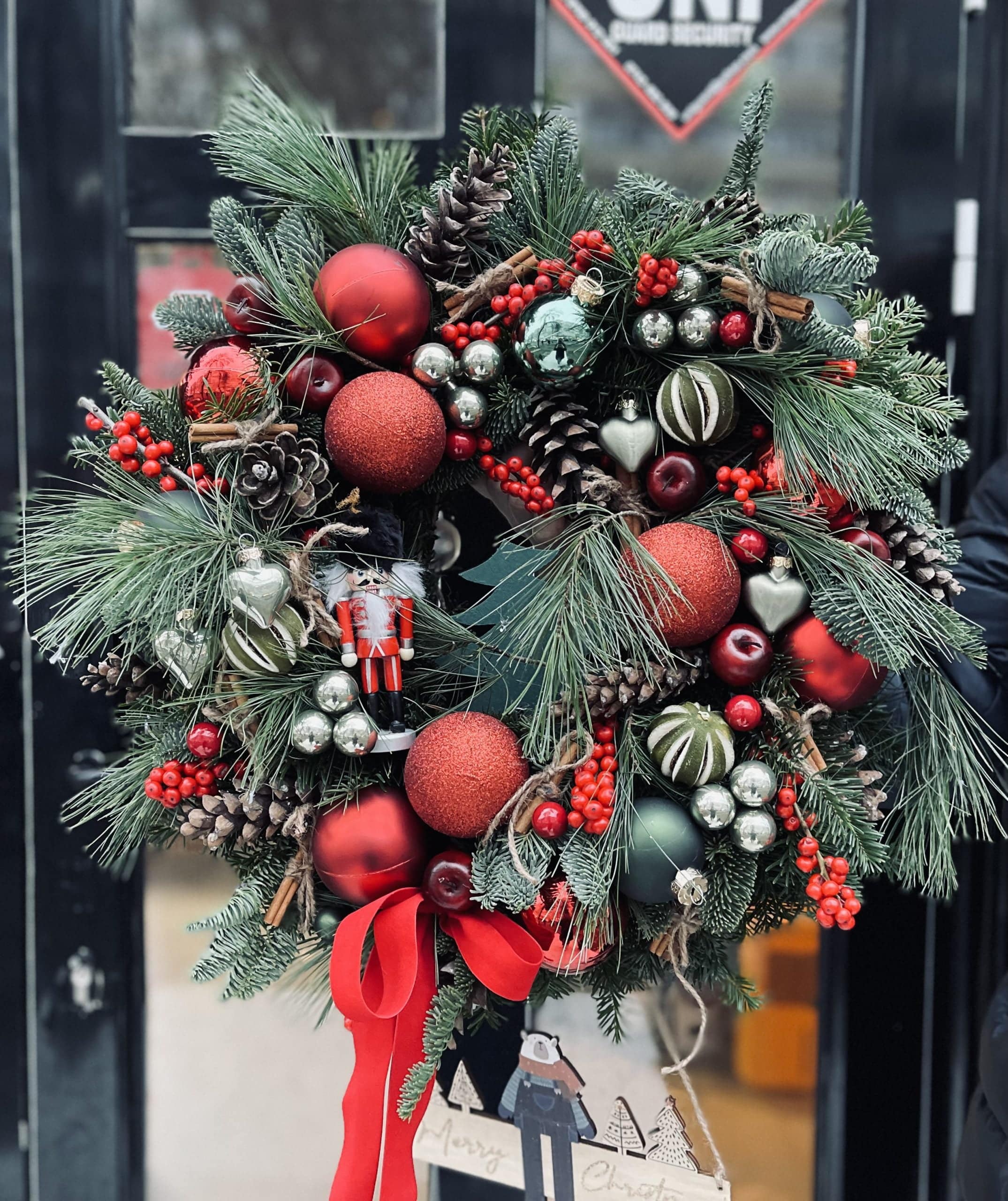 Coronița de Crăciun Red este gândită pentru uși sau pereți, aducând culoare și coerență decorului.