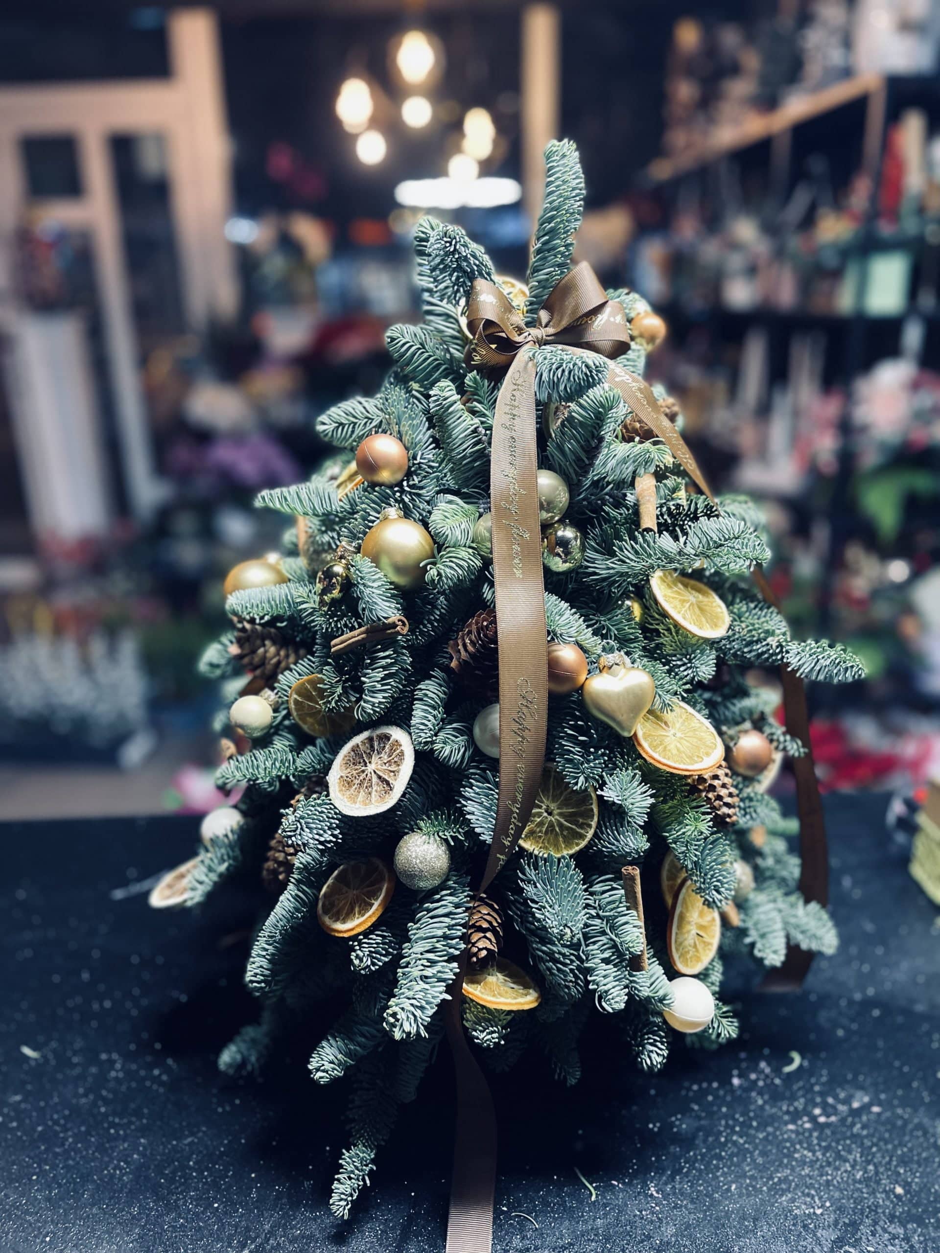 Bradul „Parfum de portocale” combină verdele bradului cu portocale uscate și detalii rustice, evocând sărbătorile clasice.